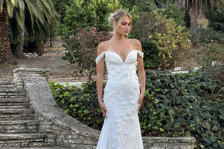 The Marseille gown features a gorgeous off-the-shoulder sleeve with a soft pleated sweetheart neckline and a dramatic fluted silhouette with side godets. The gown has a gorgeous 3-D floral & embellished contrast chiffon enhancing the shape of the gown and creating a dramatic aesthetic.