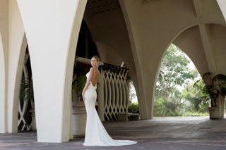 The San Miguel gown features a gorgeously draped cowl neckline, a thoughtfully shirred bodice, a soft fluted silhouette and a dramatic open cowl back.