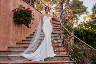 Sleek and sexy gown made from a luxurious double satin with a modern plunge neckline, intentionally designed seaming and cascading train.