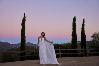 Give off all the Greek Goddess vibes in this exquisite gown with a full, flowing skirt, completely open back, hand-cut flower detailing and a stunning back drape piece.
